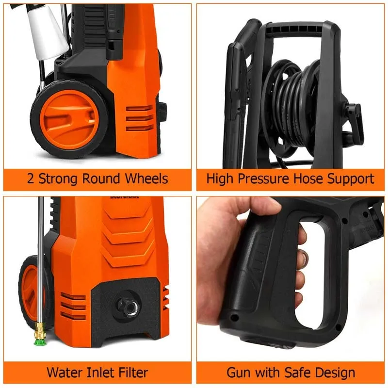 - Easy to Move & Use: The electric pressure washer consists of two big wheels and an ergonomic handle for easy moving. Next, the cleaning scope of this washing machine is larger with its 17ft (8m) high-pressure water pipe and 31ft (11m) power line.