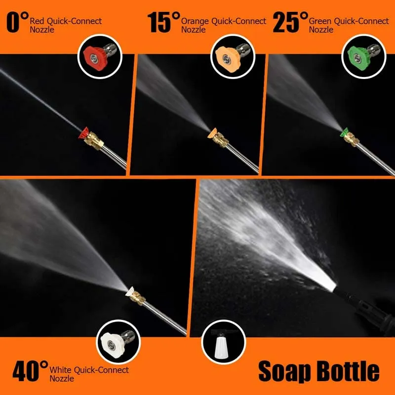 - 4 Interchangeable Nozzles & Soap Bottle: The high-pressure washer comes with 4 quick-connect nozzles of various sizes (0", 15", 25", 40"). It's useful for multiple scenarios making the cleaning process more efficient. Additionally, detergent or disinfectant can be stored in the soap bottle for deep cleaning.
