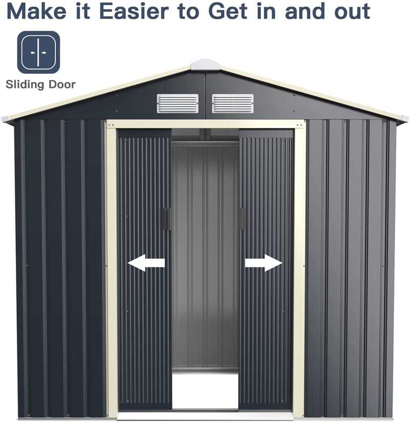 This outdoor metal storage shed with sliding double lockable doors is specially designed for tidying up your outdoor space, perfectly meeting your multiple purposes, such as a tool room, a garbage chamber, a pet house, and an outdoor rest place. Crafted with color-coated steel, this metal storage shed is sturdy and durable for long-term outdoor use. All sheets are closely connected with each other with metal screws, protecting stuff from bad weather. What's more, the double sliding door with a lock hole allows you to select a matching lock and enhance the stuff's safety. And it is designed with 4 vents to increase the inside air ventilation for better storing items. This roomy storage shed comes with 25.6sq.ft floor space, meeting all your storage needs.