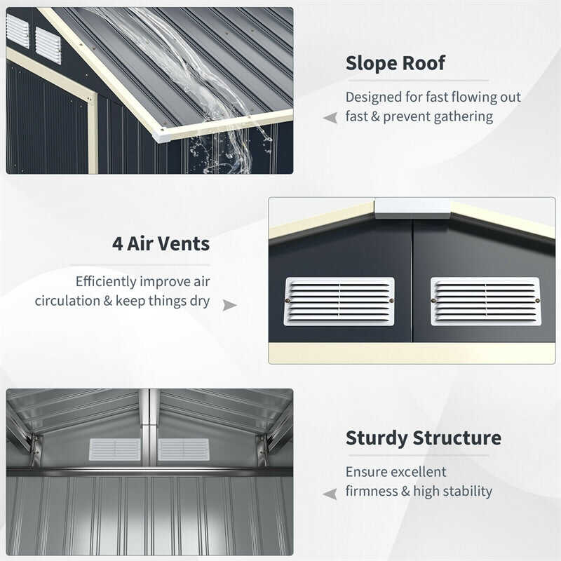 - Thoughtful Design for Better Use: This metal storage shed comes with 4 necessary vents to increase light getting and air ventilation, helping to prevent odor and reduce moisture accumulation. Moreover, the inclined slope roof is specially designed to prevent rainwater from gathering and rusting. Thus, these humanized functions will effectively protect your items from weather damage.