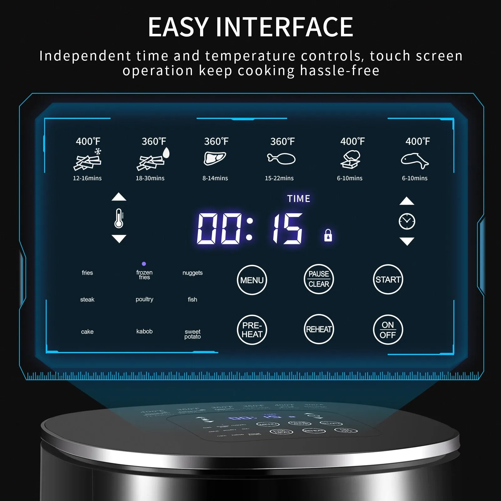 - 9 Cooking Presets: fries/frozen: fries/nuggets/steak/poultry/fish/cake/kabob/sweet potato