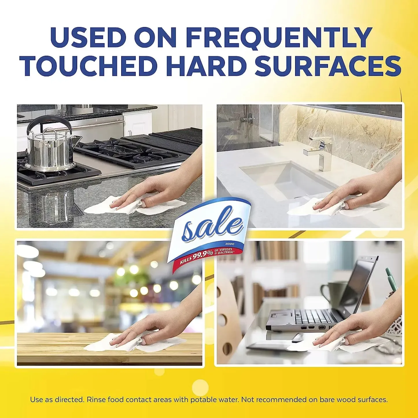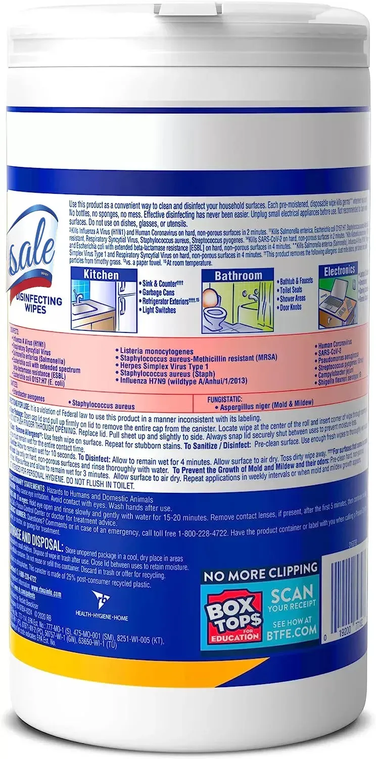 Lysol Disinfecting Wipes can be used as a convenient way to clean and disinfect your household surfaces. Each pre-moistened disposable disinfecting wipe kills 99.9% of germs when used as directed. No bottles, no sponges, no mess. Lysol Disinfecting Wipes are great for cleaning most surfaces and disinfecting surfaces. These Lysol Wipes kills 99.99% of all viruses and bacteria, including the following: Cold and Flu Viruses, Salmonella Enterica (Salmonella), Influenza A Virus, Herpes Simplex Virus Type 1, Respiratory Syncytial Virus, and COVID-19 when used as directed on hard, non porous surfaces. Each cleaning disinfecting wipe kills cold and flu viruses and helps stop the spread of germs, perfect for touch-up cleaning. Lysol Wipes are also approved to remove more than 95% of allergens. Like germs, allergens exist on hard surfaces. Use Lysol wipes as directed. These disinfecting wipes are even suitable to use on wood. How to Use Lysol Disinfecting Wipes? Pre-clean surface. Use enough fresh disinfectant wipe to thoroughly wet the surface. To Sanitize with these cleaning wipes: Allow to remain wet for 10 seconds. To disinfect with these cleaning wipes: Allow to wet for 4 minutes. To clean and remove allergens with these cleaning wipes: Use fresh wipe on surface. For surfaces that come in contact with food, rinse thoroughly with water. Repeat for stubborn stains. For more than a century, Lysol has been helping to protect families from illness-causing germs. To learn more about our mission and find further disinfecting solutions, solutions for household cleaning, and disinfectant spray products, visit our website or check out our instagram.