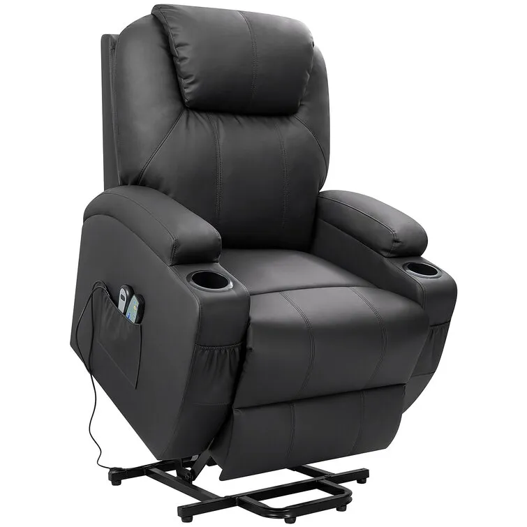 Upgrade your living room experience with this power reclining full-body massage chair. It's built on a solid wood and metal frame and is wrapped in faux leather upholstery with a foam filling for just the right amount of support. There are built-in pockets and cup holders to help keep your relaxing essentials close by. This chair can recline to three different positions, and it has a lift assist to make getting out of the seat a little easier. There are four sections of your body for massage and five rhythms of massage mode, with two massage intensities that can be switched to meet your needs. While the whole lift recliner chair offers you a zero-gravity experience. Plus, there's a local heating function that can help to ease back pain.