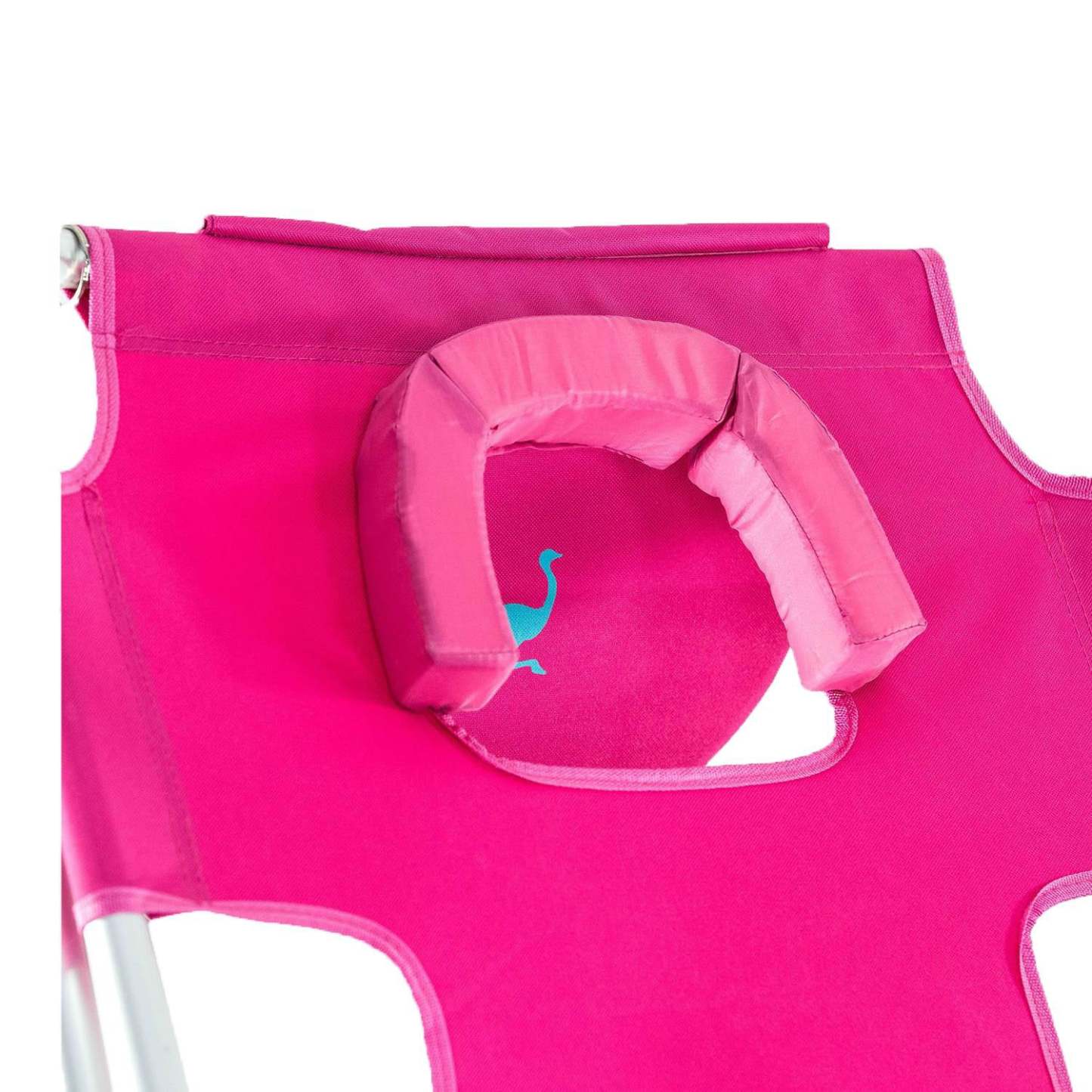 Get outside in the sun with this lounge beach chair. It's always a tanning type of day with this chair. This sunbathing chaise lounge is lightweight, rust-resistant, and features an open or close face cavity with armholes and a pillow for the most relaxing ray-catching ever. Pack it up for the beach, lake, or the long, romantic walk to your backyard pool or patio. With its built-in carrying strap, you won't mind strutting through the sand or walking around to find that ideal spot to get your bronze on. It holds up to 275 pounds, shows off a pink color, and has 5 adjustable chair positions with 3 adjustable footrest positions.