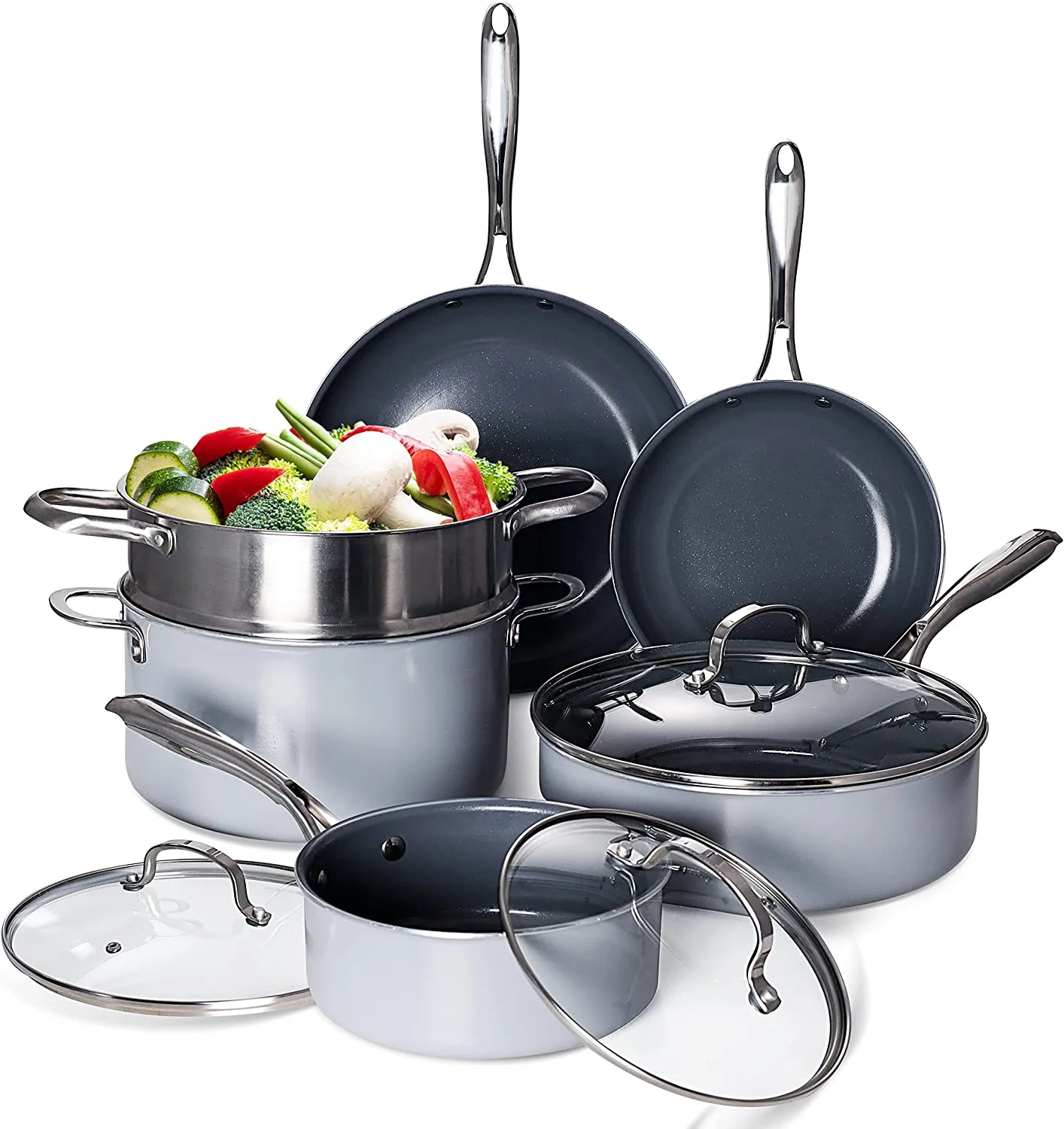 - COOKWARE SET INCLUDES - 8.7" and 11" Fry Pans, 10.3" Saute Pan with Lid,1.7QT saucepan with lid, 6QT stockpot with lid, Stainless Stainless steel steamer basket and four wheat straw bowls. A basic combination for your daily kitchen needs.