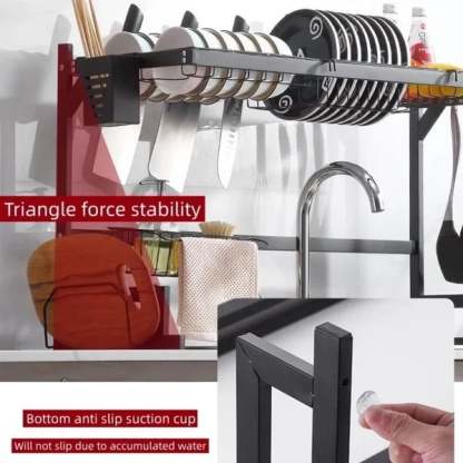 Sturdy and stable - The kitchen countertop dish rack is made of premium metal steel with a baked-on finish. The bottom of the shelf is equipped with suction cups that ensure absorption and prevent the shelf from wobbling in any direction.