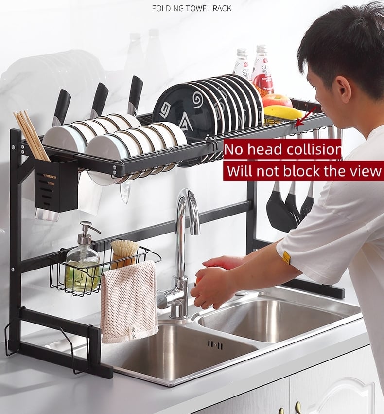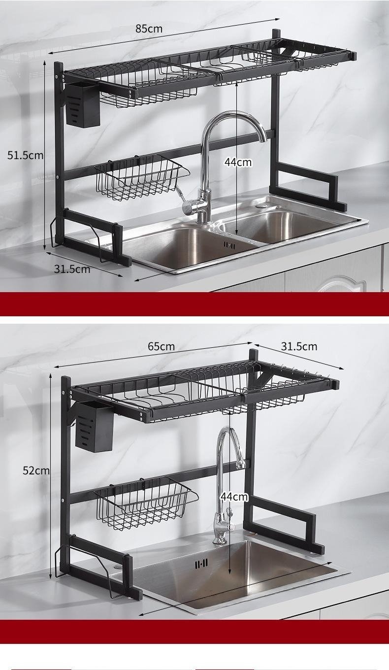 Adjustable - Freely adjust the length of the dish rack (from 65cm to 85cm). This over-the-sink dish drying rack uses short screws to lock the center square tube to adjust the length. Exterior dimensions of the rack: (65cm to 85cm) Length x 31.5cm Width x 51.5cm Height. Increasing the distance between the shelf and the basket allows the height of the faucet to be adjusted.