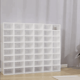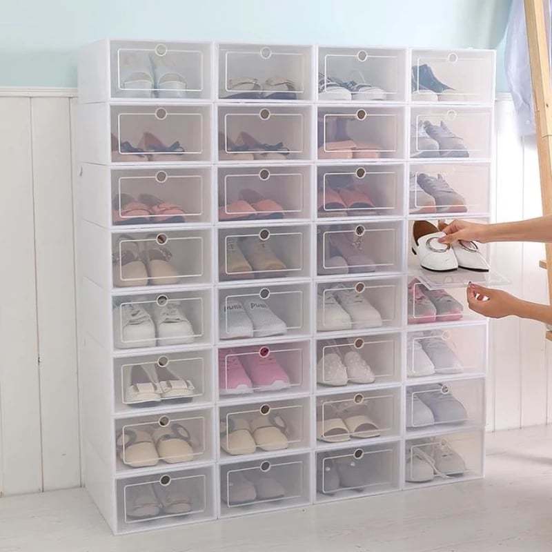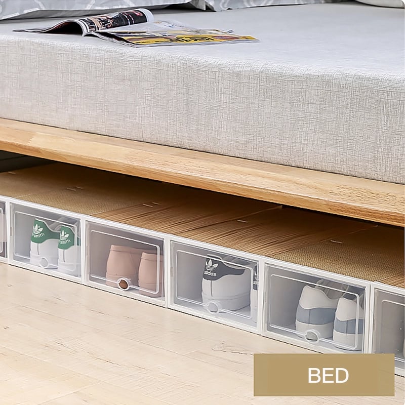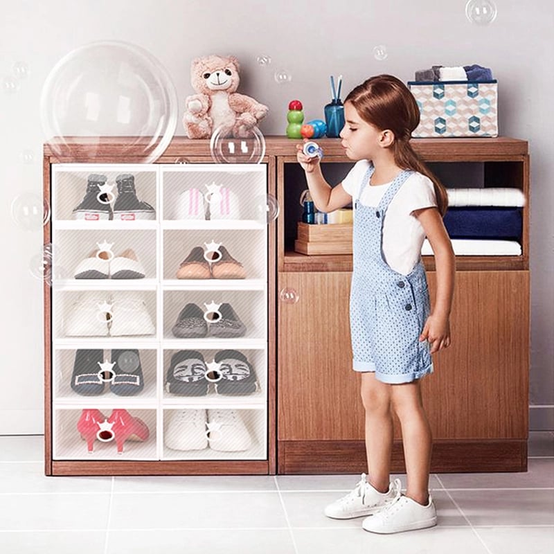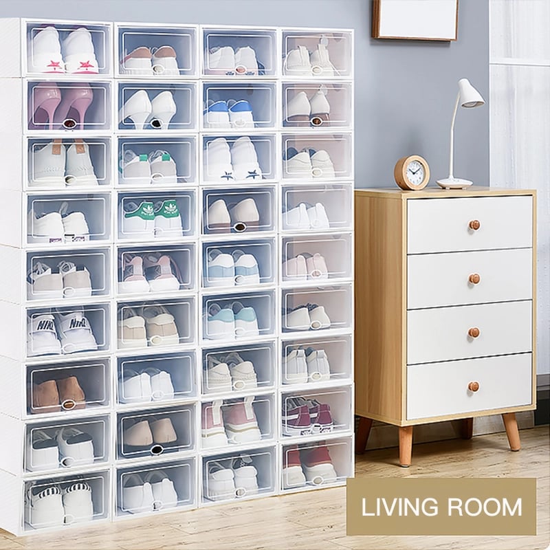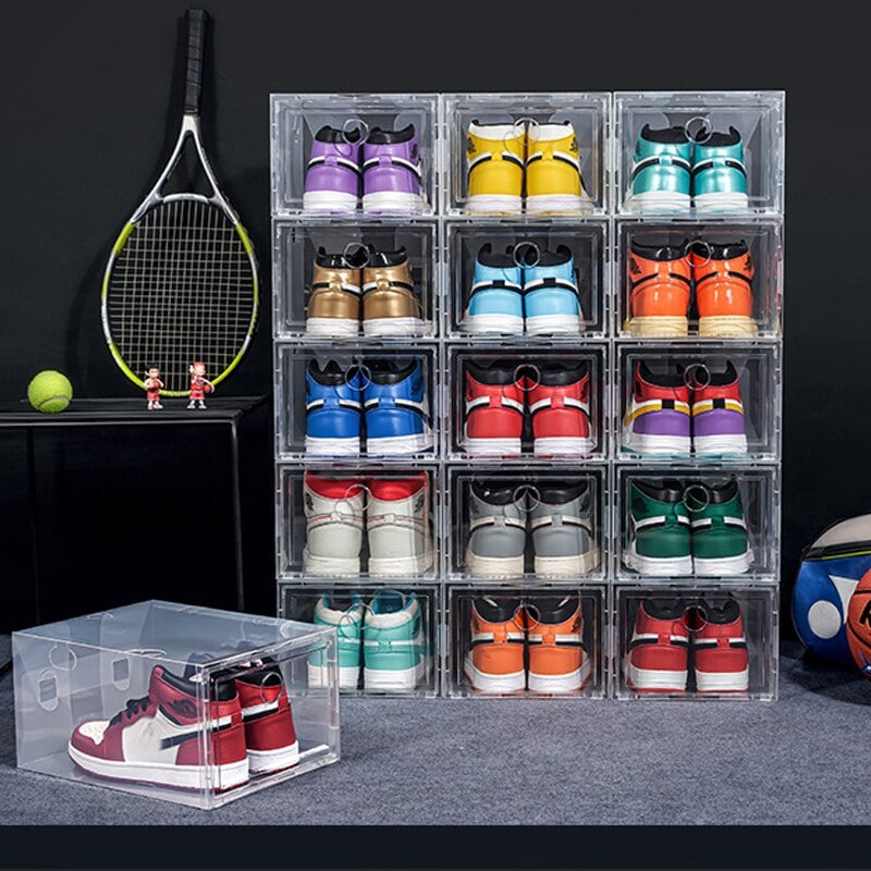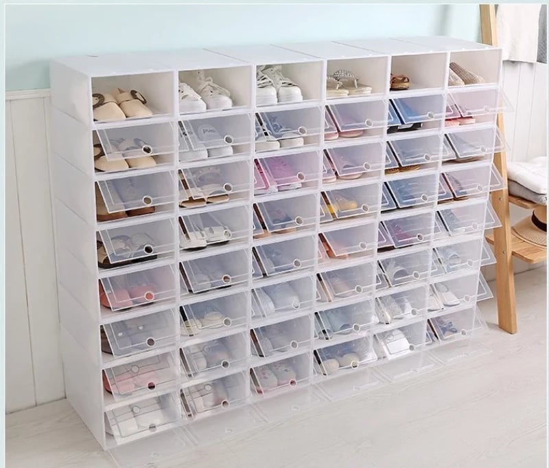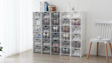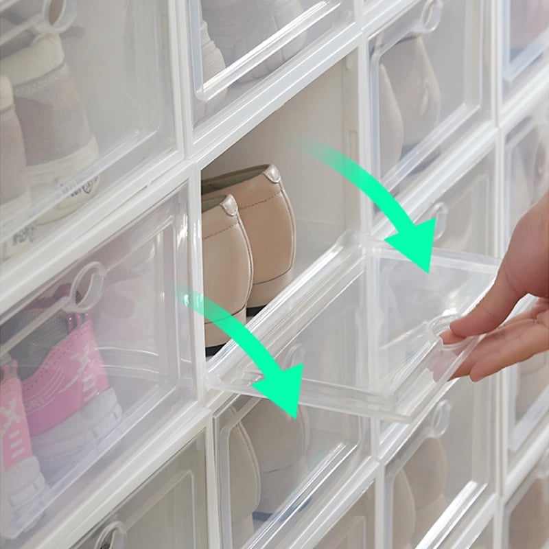 Our shoe storage boxes have drop front doors so you can easily access your shoes even when units are stacked or on a high shelf. The clear front and sides allow you to see what's inside at a glance