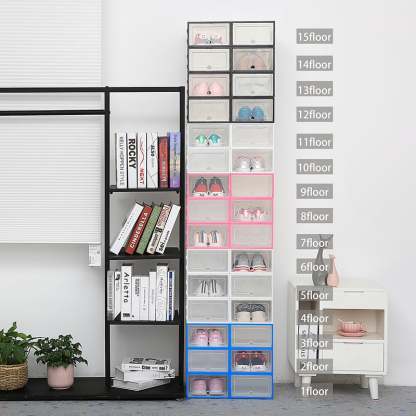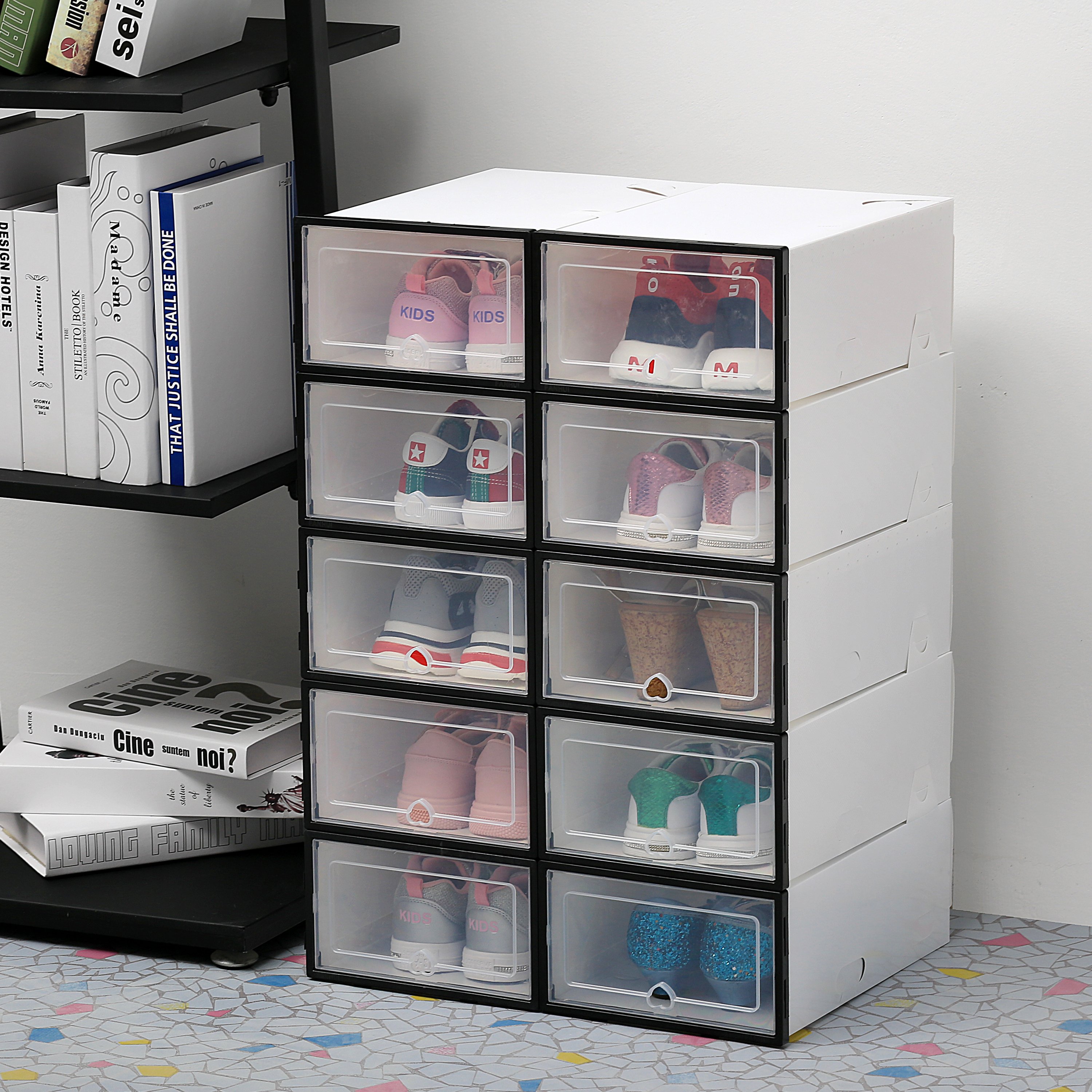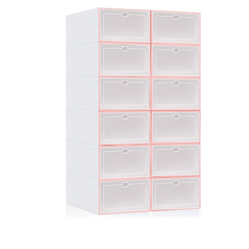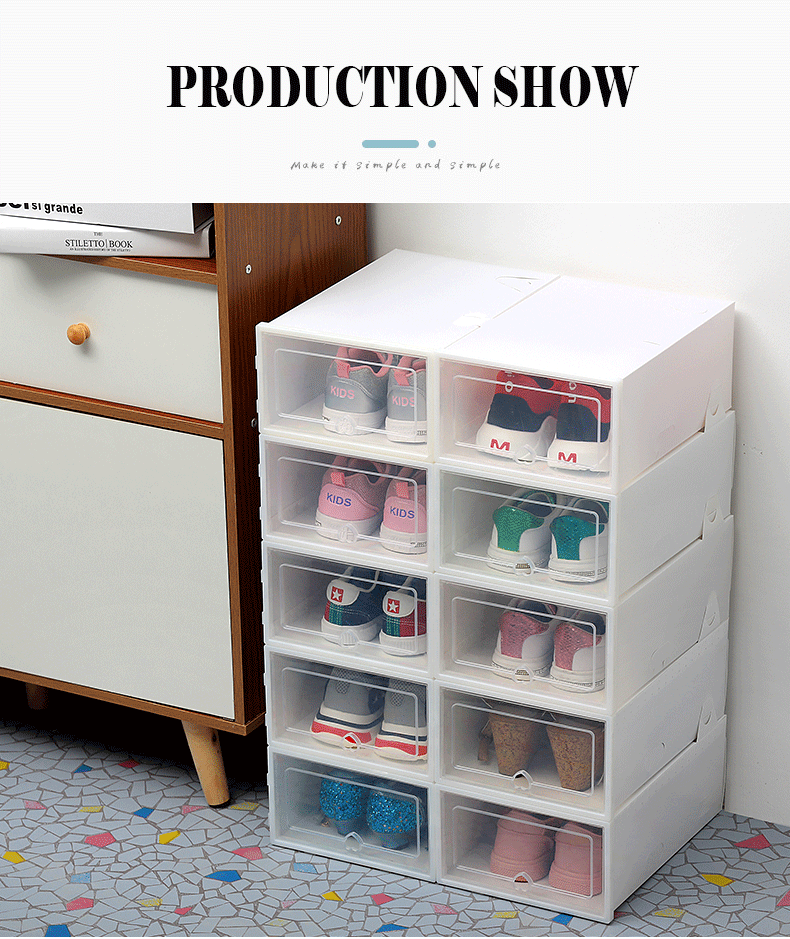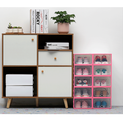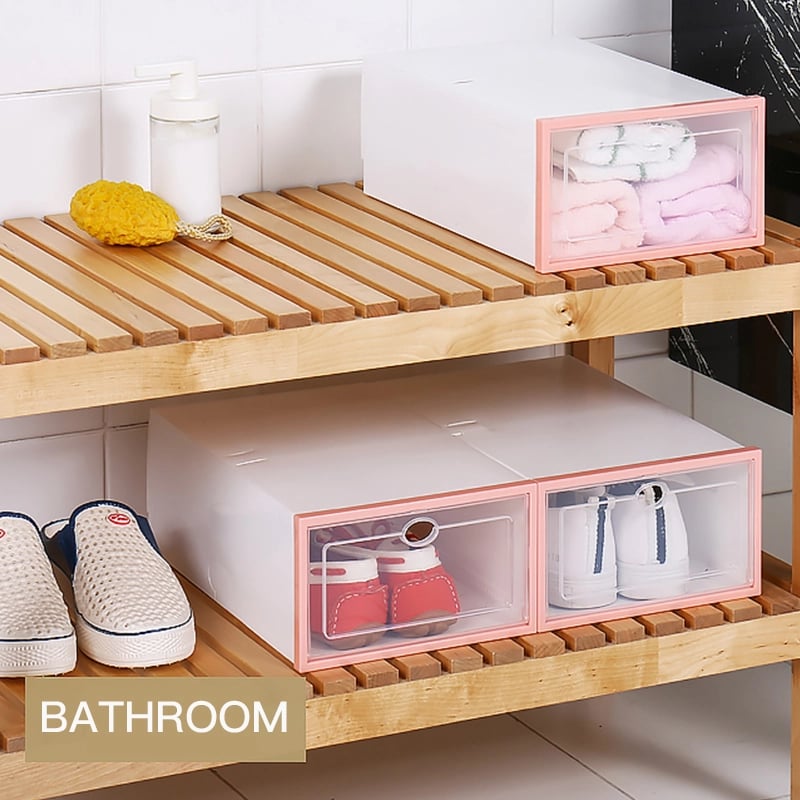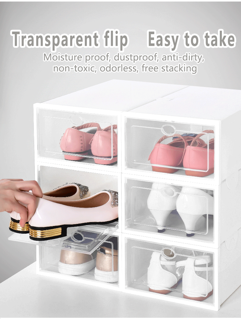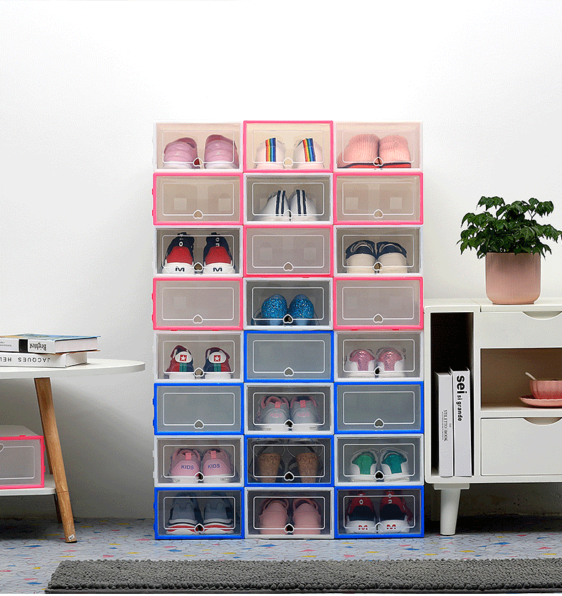 Our shoe storage boxes have drop front doors so you can easily access your shoes even when units are stacked or on a high shelf. The clear front and sides allow you to see what's inside at a glance
