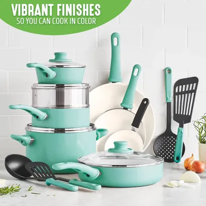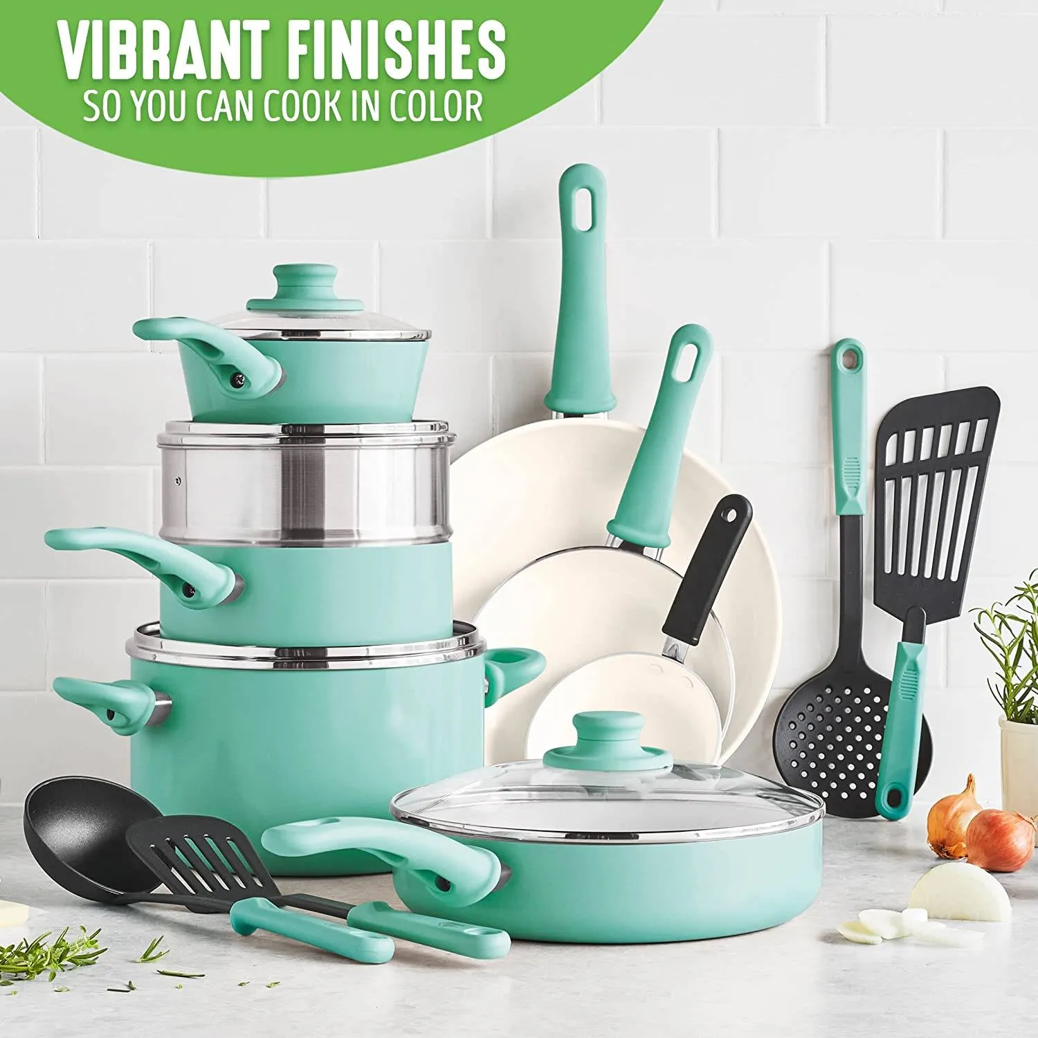 Soft Grip Healthy Ceramic Nonstick 16 Piece Cookware Pots and Pans Set, PFAS-Free, Dishwasher Safe, Turquoise